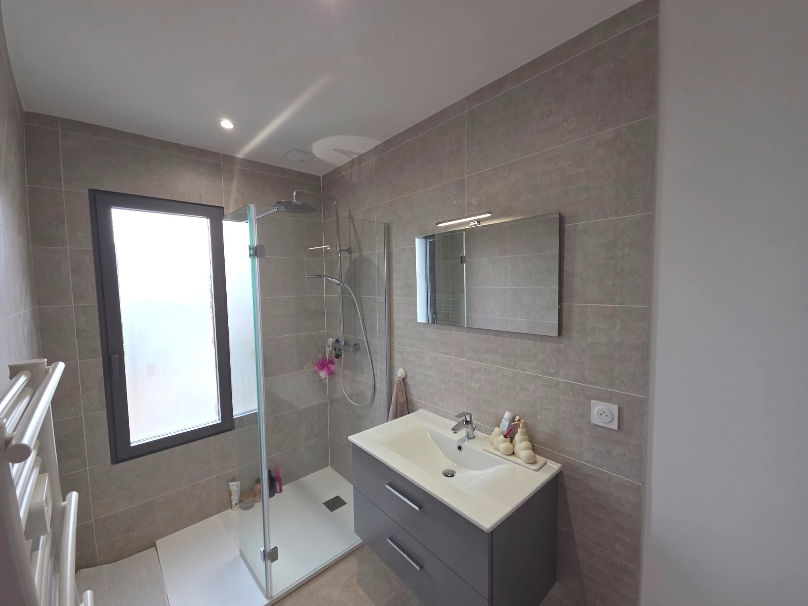 Vous apprécierez les prestations haut de gamme : Normes RT2020, Climatisaion gainable, travertin,