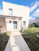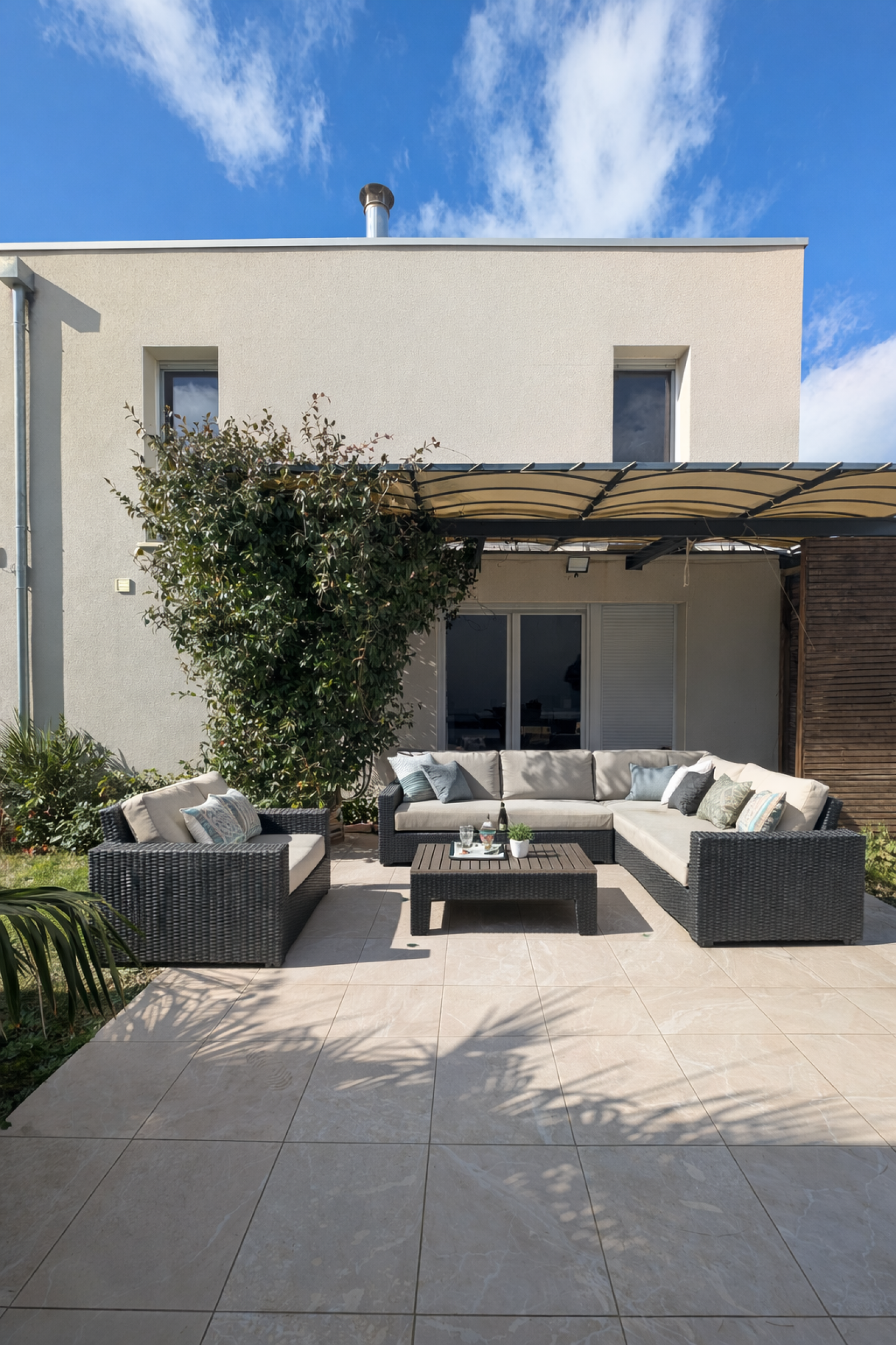 À l’extérieur, un jardin intimiste prolonge la maison et s’ouvre sur une grande terrasse carrelée de 30 m², idéale pour recevoir ou profiter des beaux jours en toute tranquillité.