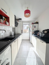 Le rez-de-chaussée offre une pièce de vie lumineuse de 28 m², exposée sud-est, réunissant salon et salle à manger. La cuisine équipée, actuellement indépendante, peut être ouverte pour créer un espace de vie plus contemporain. Un WC indépendant et un grand placard aménagé complètent ce niveau.