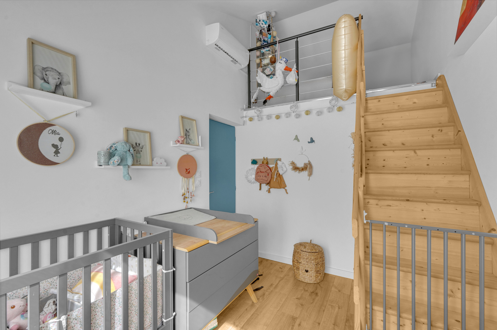 À l’étage, la suite parentale de plus de 30 m² offre un véritable espace privé. Elle se compose d’un dégagement pouvant accueillir un bureau ou un coin lecture, d’un espace nuit, d’un dressing et d’une salle d’eau.