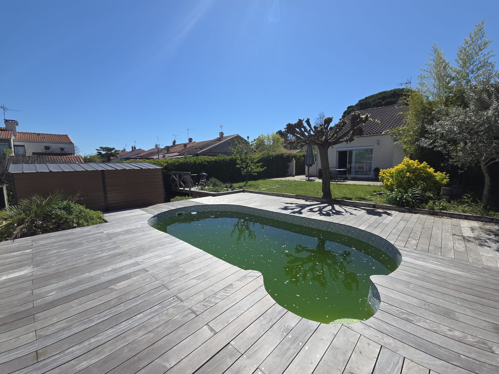 Implantée sur une parcelle arborée de 439 m², la propriété propose plusieurs espaces de vie extérieurs : terrasse, piscine entièrement rénovée en 2025 (membrane sous garantie 9 ans, terrasse en ipé sous garantie décennale), ainsi qu’une dépendance de 12 m² abritant le local technique et un espace de stockage. Un coin potager à l’avant et un espace zen avec mare complètent l’ensemble.
