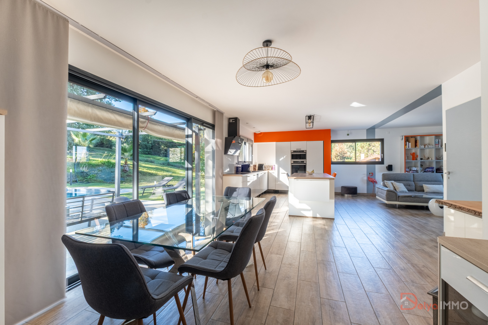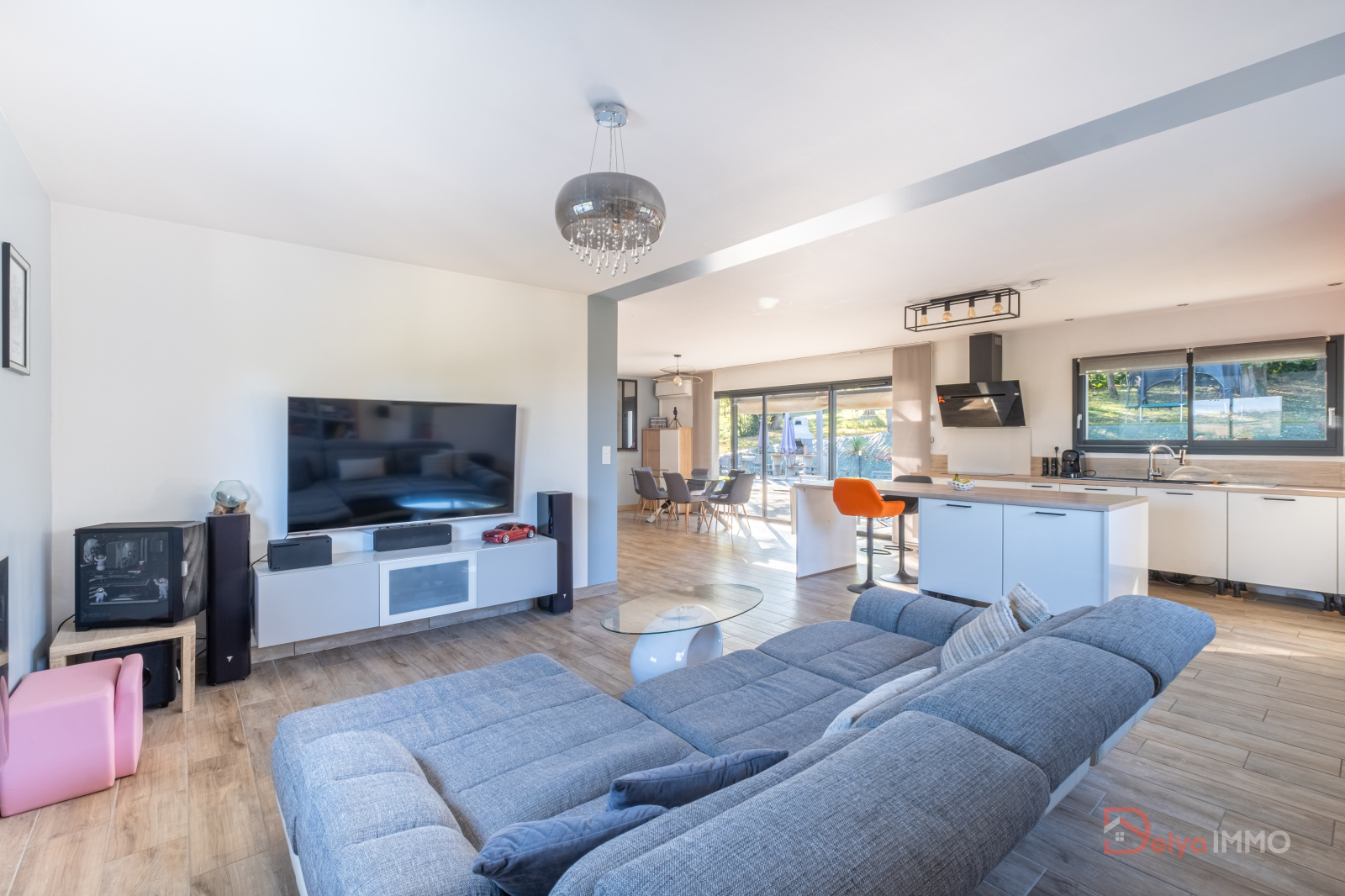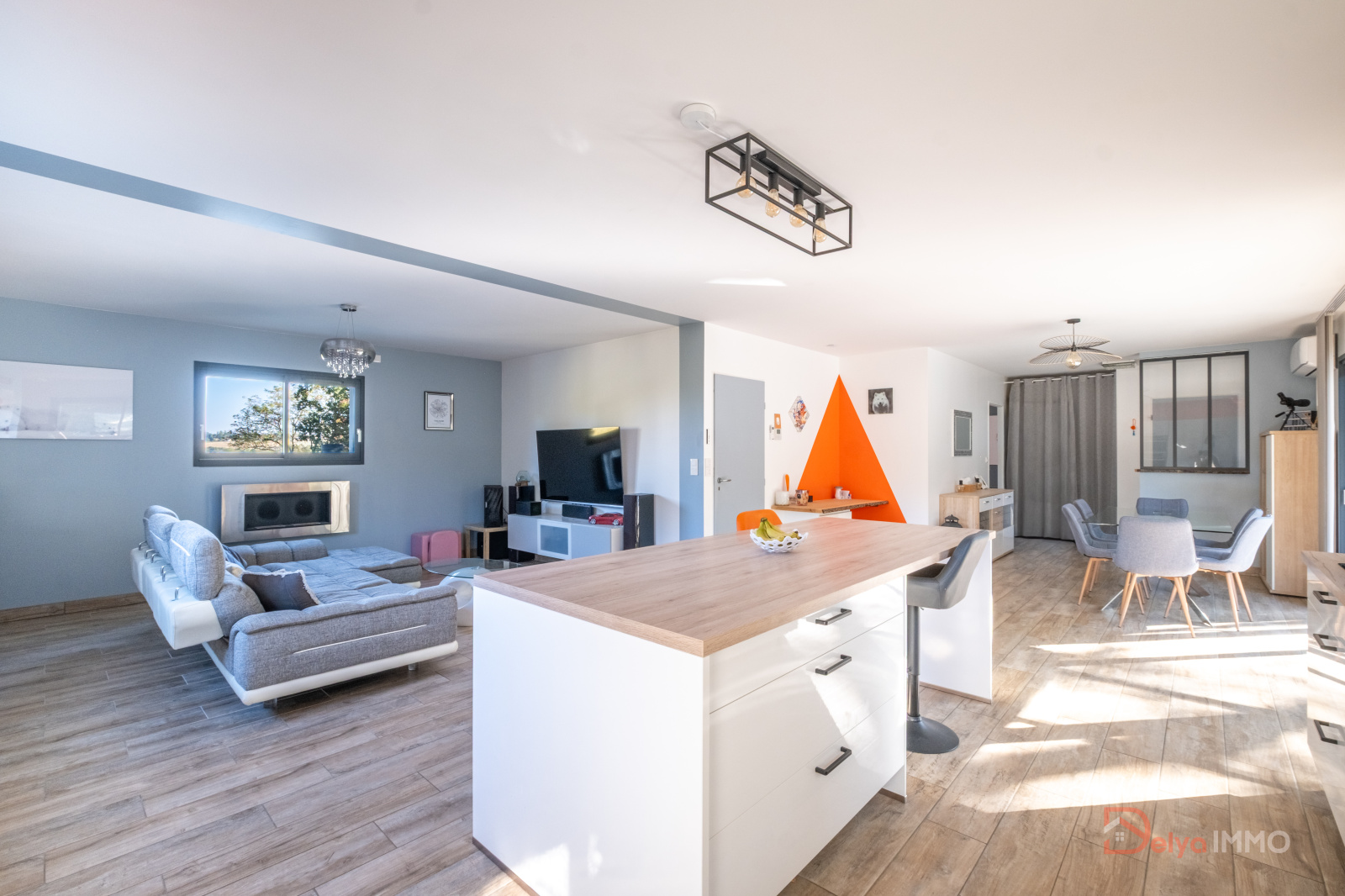 La maison se compose d’une vaste pièce à vivre de 60 m² baignée de lumière, intégrant un espace salon-salle à manger et une cuisine équipée moderne.