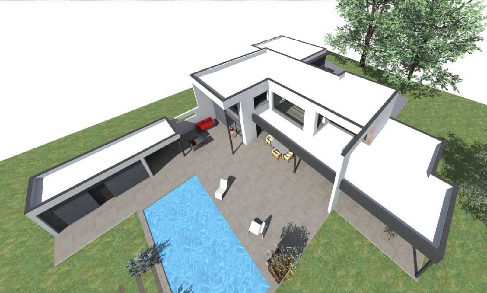 Les extérieurs comprennent une piscine 4 × 10 m à fond plat de 1,50 m (structure réalisée) ainsi qu’un pool house. Les espaces paysagers, terrasses et clôtures restent à finaliser.