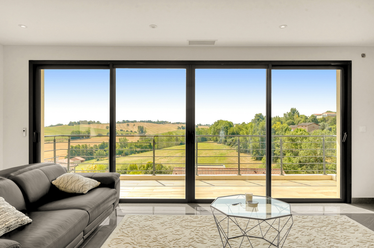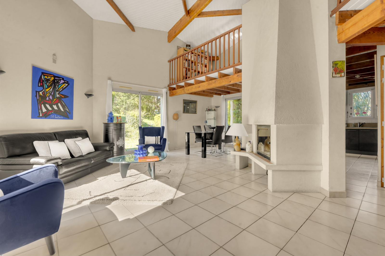 L’espace de vie s’organise autour d’un séjour cathédrale climatisé, avec triple exposition (sud, sud-ouest, nord-ouest), une cheminée et une charpente « parapluie » réalisée par des compagnons. La cuisine équipée (Cuisinella) peut s’ouvrir sur la salle à manger et dispose d’une arrière-cuisine/buanderie. L’entrée comprend un placard ainsi qu’un WC indépendant.
